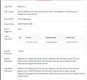 Di tengah tekanan fiskal dan meningkatnya beban ekonomi masyarakat, publik Kota Singkawang dikejutkan oleh munculnya paket anggaran bernilai Rp860.300.800 dalam Rencana Umum Pengadaan (RUP) Tahun Anggaran 2026 pada Sekretariat DPRD Kota Singkawang. Paket tersebut tercatat dengan nama “Belanja Makanan dan Minuman Jamuan Tamu” (Kode RUP: 64872319),Senin (16/02/2026)